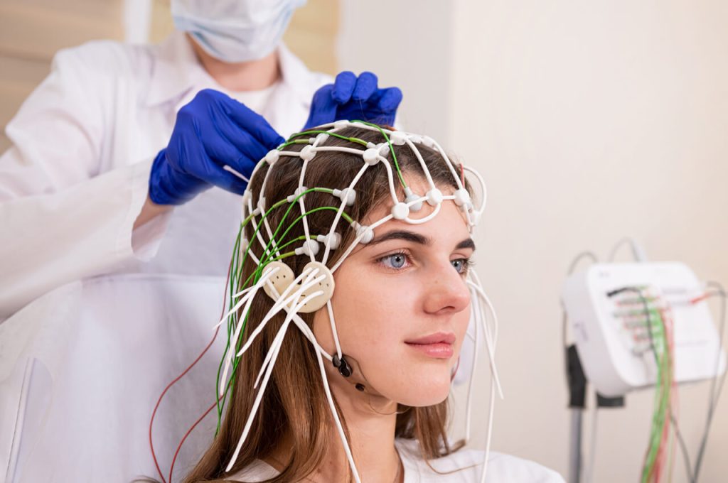 Hastanın sırt üstü yatması veya gözleri kapalı bir sandalyede oturması istenecektir. Hastanın kafa derisine, özel iletken bir macun veya son derece ince iğnelerle bir dizi elektrot yerleştirilir. Elektrotlar, beyin elektrik enerjisini ölçmek için kullanılan küçük cihazlardır ve teller aracılığıyla bir bilgisayara bağlanırlar.